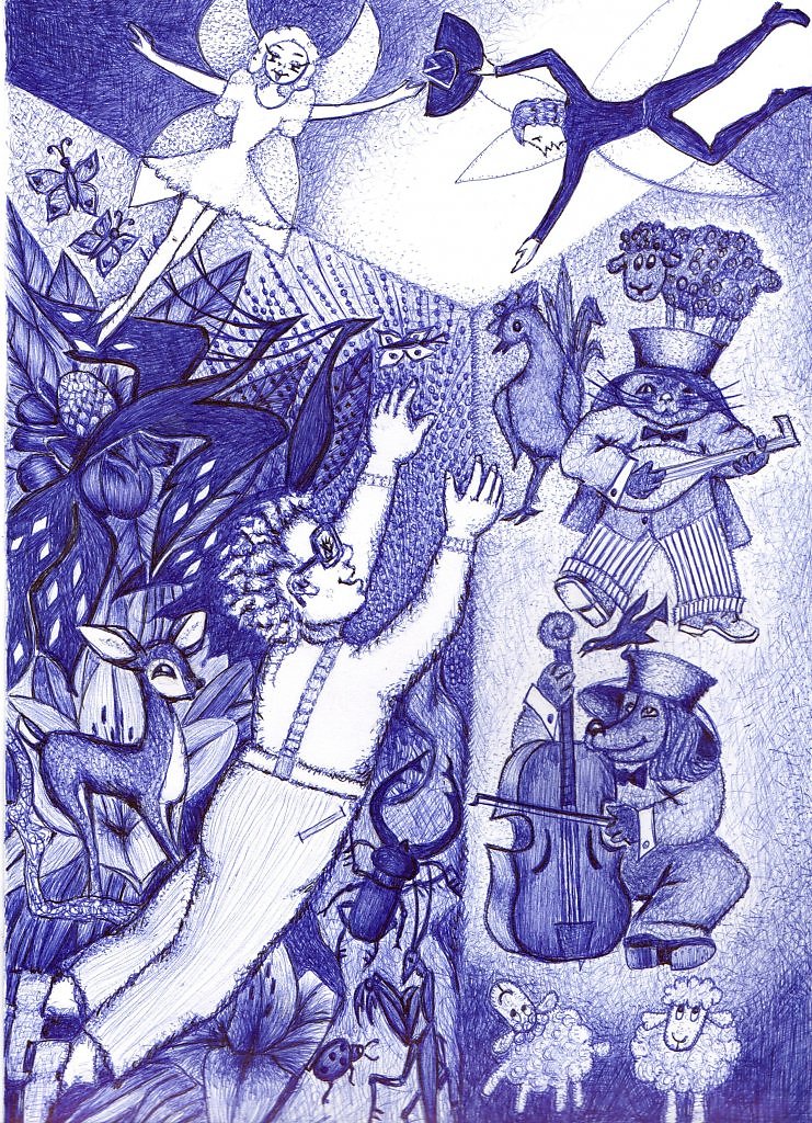 Он был охвачен волшебством летающих домов и деревьев с человеческими лицами, в окнах и ветвях которых распевали вуалехвостые птицы. Он слышал их свирельные голоса, перебиваемые детским смехом. Девочки и мальчики, мерцая прозрачными крылышками, улыбались Лешке с потолочного неба. Собаки и коты лихо играли на лютнях и волынках. Хрустальные рыбы танцевали, хлопали веерными ладошами и распространяли чарующий звон. Дождь изливался горошинами монпансье, а леденцы испарялись бабочками лимонницами. Вместо облаков по золотистому небу брели мандариновые овечки, и лиловое солнце запускало в кудрявое руно тонкие руки. Все белые пятна, какие еще оставались на стенах, были заполнены изумрудными, рубиновыми и сапфировыми жуками...