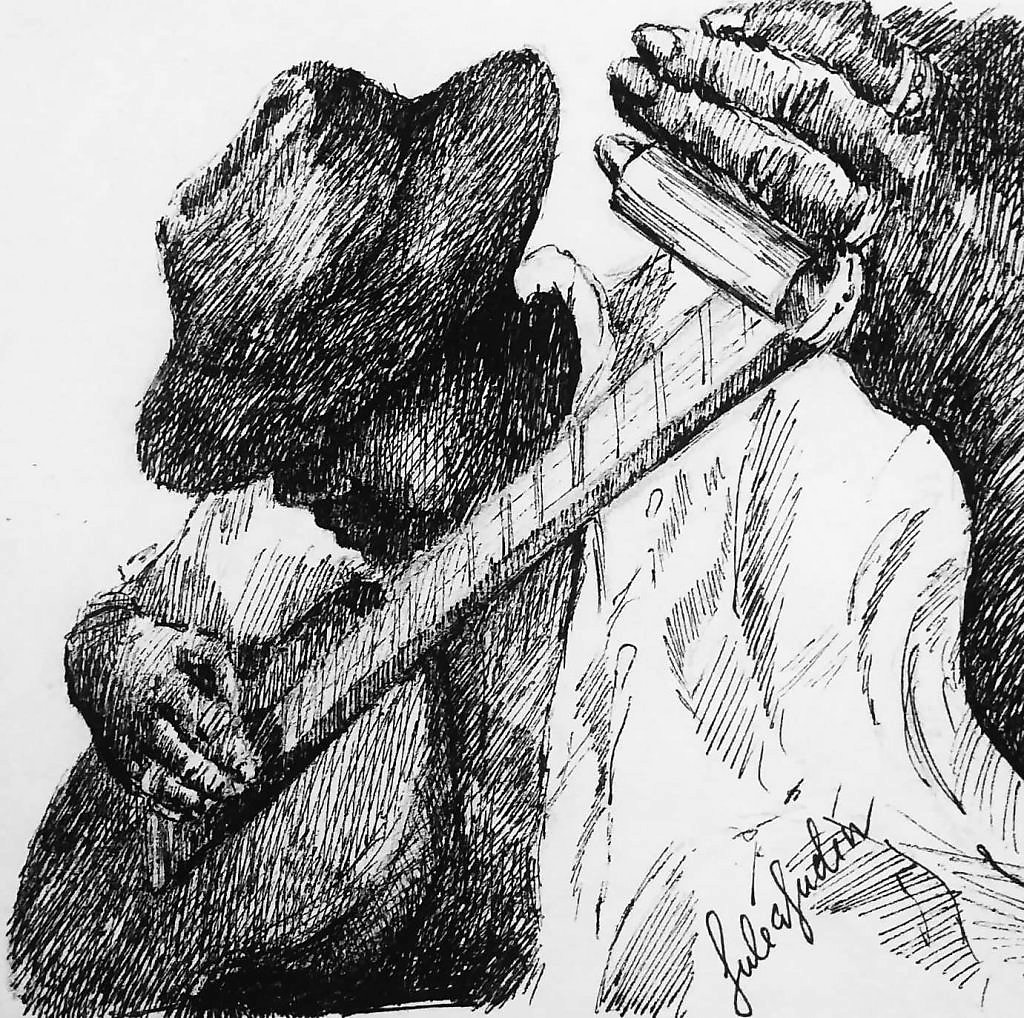 Не соглашусь. Посмотрите внимательно..вам не кажется, что слайд пассажи блюзмену пытается помогает играть совсем чужая рука..да и рука ли это..скорее лапа Кинг Конга) |