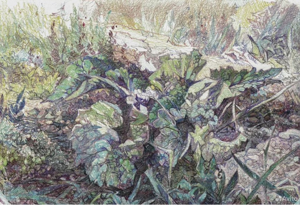 Графический пейзаж выполненный цветными карандашами на маслянной основе.