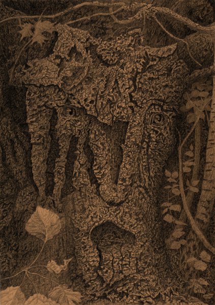я набросал основную фигуру на рисунке в лесу 25.09.11, добавил от себя глаза и преобразовал очертания на стволе сосны в нос и рот. Дома я работал над рисунком несколько дней, задний план придумал сам. Я увидел на лбу древесного лица орла, который силится взлететь, но не может, потому что одеревенел и прикреплен к дереву. Физиономия дерева, возможно, выражает недоумение и непонимание своего бессилья.