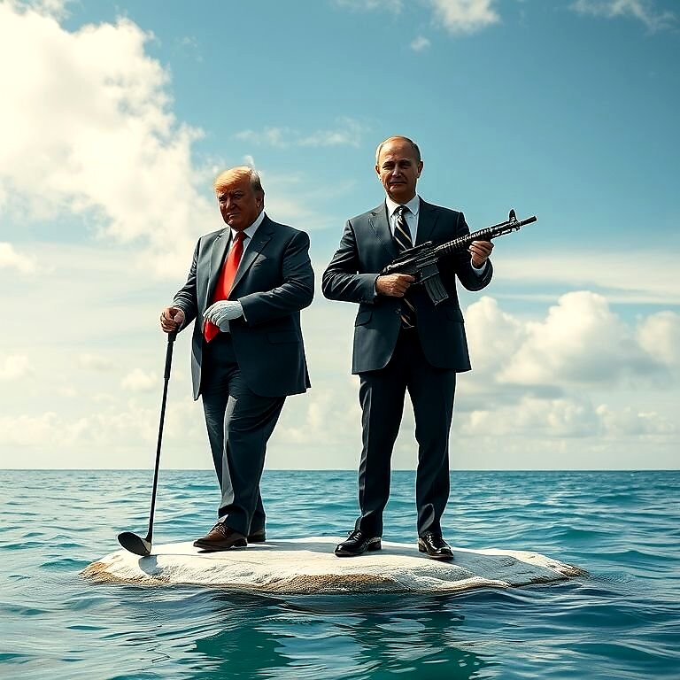 Солнце палило нещадно, отражаясь от белоснежного песка и бирюзовой глади океана. Воздух был густым и влажным, наполненным запахом соли и незнакомых тропических цветов. Владимир Путин, одетый в слегка помятый, но все еще элегантный костюм, огляделся с недоумением, которое быстро сменилось холодной решимостью. Автомат Калашникова, тяжелый и надежный, лежал рядом, его металл приятно холодил руку. Он помнил последние секунды перед катапультированием: крики, грохот, ощущение невесомости, а затем – резкий удар о воду. И вот он уже на берегу, и видит перед собой …Дональда Трамп, с его фирменной копной волос и с традиционным красным галстуком, который стоял в нескольких метрах от него, держа в руках свой тяжелый "драйвер" для гольфа, словно это было самое грозное оружие на планете. Лицо Трампа выражало смесь удивления, гнева и, возможно, даже некоторого азарта. Он тоже помнил хаос, панику, и как его буквально вытолкнули из капсулы. И теперь он видел перед собой Путина, в вызывающем темно-синем галстуке в белую косую полоску!