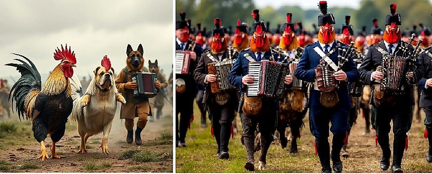 Но Макрон, не понимая шуток, закричал: "В атаку!" И тут начался самый настоящий блицкриг. Грохот пушек раздавался, как будто на кухне кто-то готовил огромные пироги, а петухи, по-прежнему, истошно кричали, словно их звали на утреннюю пробежку.