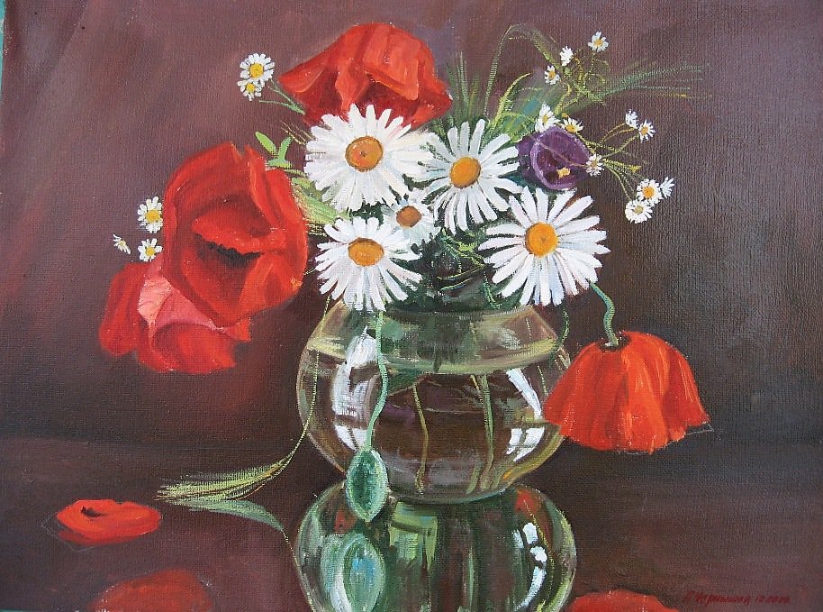 Очень красиво белые лепестки ромашек на фоне красных маков смотрятся. Замечательная работа. Особенно в цвете. Успехов !