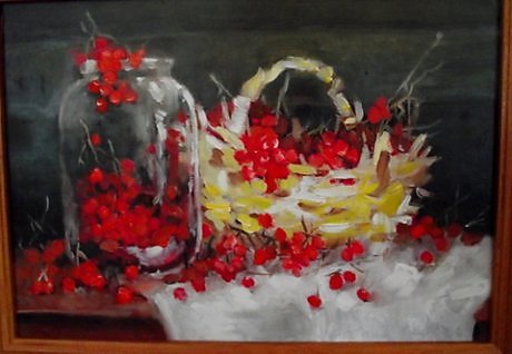 Очень красивый натюрморт красной рябины.Автор использовал сочные яркие краски,выглядит рябина натурально.Желаю победы в конкурсе.