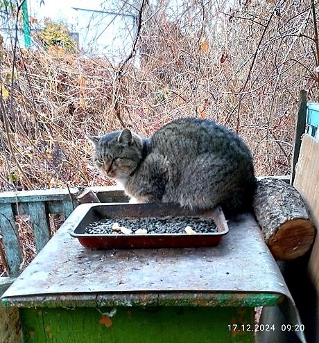 Так это не для него, а для синичек. Вот он и ловит их на приманку. Правда, с такой тактикой у него ничего не получается, но он и так сыт и откормлен )