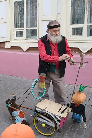 Очень колоритный дед с маленькой очень умной собачкой развлекает ребятишек, розыгрывает различные кукольные сценки.