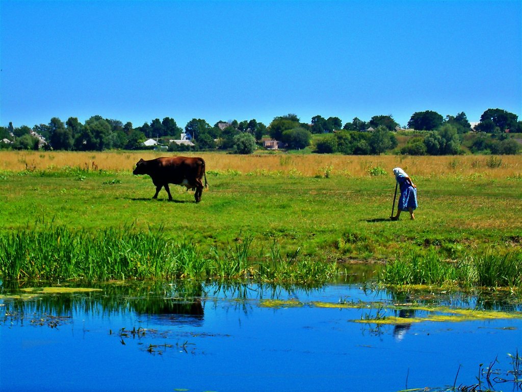 Я думала это Ваш досуг, а это бабулина работа. Красивый снимок, зелень, водоём, но бабуля зря тут.