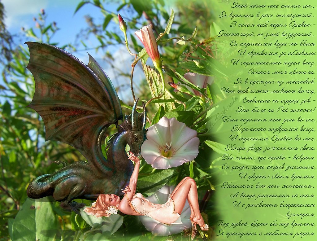 Я купалась в росе жемчужной… В синем небе парил Дракон - Настоящий, не змей воздушный… Прекрасный сон! Браво! |