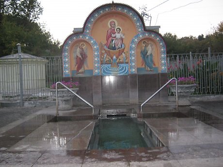 Посередине изображена икона божьей матери « Живоносный Источник». Сама купальня была освящена на Крещение в этом году епископом Онуфрием. Возле купальни всегда толпятся любители окунуться в холодную воду и закалиться, ведь вода и летом не прогревается выше 7 градусов. Зимой температура воды около 2 градусов. Есть здесь и оригинальный душ в виде тучки с дырочками, из которой льется мелкими струйками вода. Тучка закреплена на ножке - радуге. Чуть в отдалении построены песочницы, спортивные снаряды и качели для детей. Взрослые здесь могут поиграть в настольный теннис. Выше на холме, если подняться наверх, находится ботанический сад, на котором посажены оригинальными клумбами цветы среди ландшафта из мха и камней. Но, далеко по саду ходить не разрешается. Там, где растут розы и гладиолусы, находится табличка « Посторонним вход запрещен!». Территория ботанического сада огорожена, но все равно туда забредают влюбленные парочки или любители шашлыков летом. Летом на лужайках вокруг родника располагаются на покрывалах любители солнечного загара или пикников на природе.