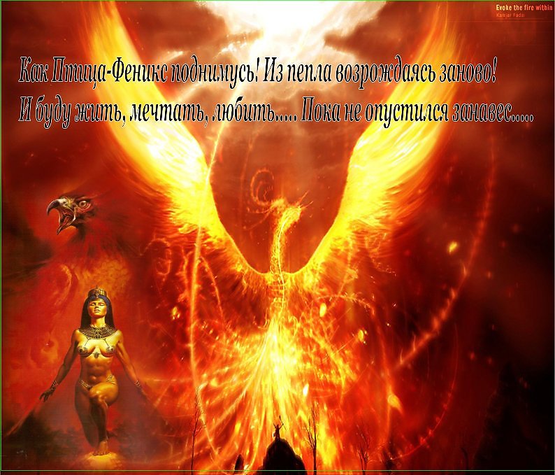 Как Птица-Феникс поднимусь! Из пепла возрождаясь заново! Я буду жить, мечтать, любить … пока не опустился занавес. |