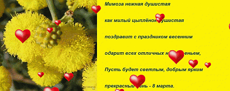 ВЕСНОЙ РАСПУСКАЮТСЯ НЕ ТОЛЬКО ЦВЕТЫ - ВЕСНОЙ РАСЦВЕТАЕТ ДУША. И ПУСТЬ БУДЕТ ТЕПЛО, СВЕТЛО И РАДОСТНО НЕ ТОЛЬКО 8 МАРТА, НО И КАЖДЫЙ ДЕНЬ В ГОДУ БУДЕТ ЯРКИМ И ПРАЗДНИЧНЫМ ♥ И ни один праздник 8 марта не обходится без нежной пушистой мимозы ))) И пусть праздник будет наполнен мелодией волшебной мазурки.