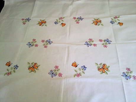 скатерть с цветами и бабочками, вышита вручную крестиком. ткань и нити хлопковые. размер 160х130. 50eur